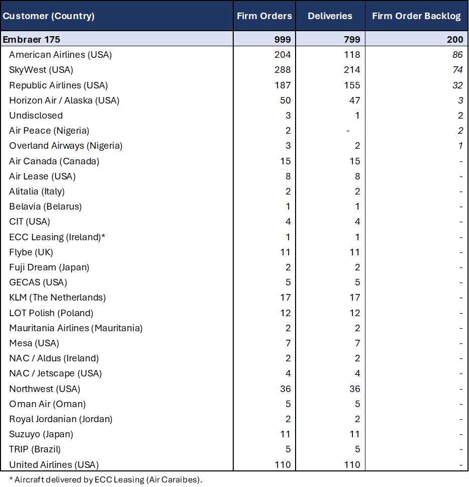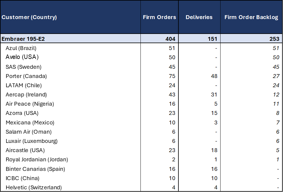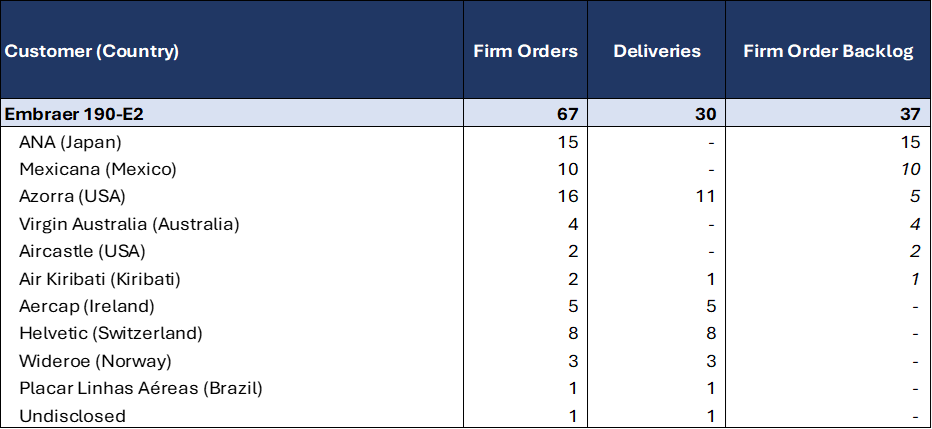 The models delivered during the period were the E175 to American Airlines (4) and Republic Airlines (3), the E190-E2 to Azorra (2), and the E195-E2 to Porter (4), Azorra (3), Aircastle (2) and Mexicana (2).