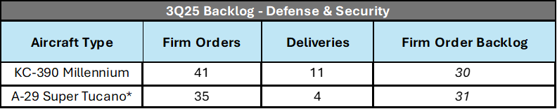 In Defense & Security, the backlog reached US$3.9 billion in 3Q25, up 8% yoy. The business unit delivered the third KC-390 Millennium to the Portuguese Air Force.