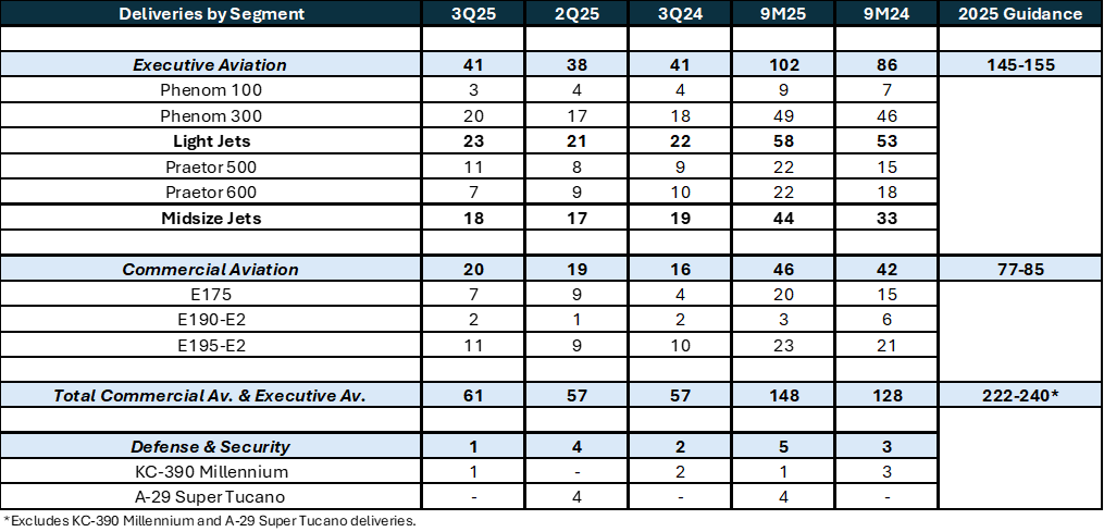 In 3Q25, the business unit delivered 20 new aircraft, 4 more than the 16 delivered in 3Q24. Consequently, during the 9M25, deliveries totaled 46 aircraft or 57% of the midpoint of the full year guidance (between 77 and 85 in 2025), 2 percentage points above the 55% average recorded for the period over the past 5 years. Looking forward, we expect more tangible results from our production leveling initiative in 2026.